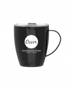 12 oz double wall 18/8 stainless steel thermal mug with copper vacuum insulation, clear acrylic push-on lid, and matching swivel; Hand wash recommended; Do not microwave; 4-7/16" h x 4"w (4-7/8 with handle) ; 355mL.
