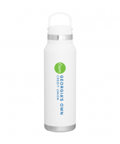25 oz double wall 18/8 stainless steel thermal bottle with copper vacuum insulation, threaded insulated lid with carrying handle, high polish accent, stainless steel base, and powder coated finish. Hand wash recommended; Do not microwave. Dimensions: 10 H x 3".
