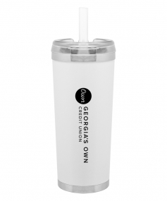 24 oz double wall 18/8 stainless steel thermal tumbler with copper vacuum insulation, stainless steel rim and base, threaded Eastman Tritan lid, snap closure, straw opening, and flexible wide silicone straw.